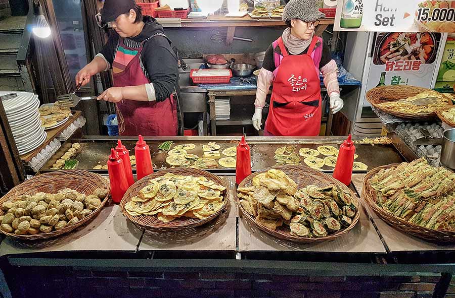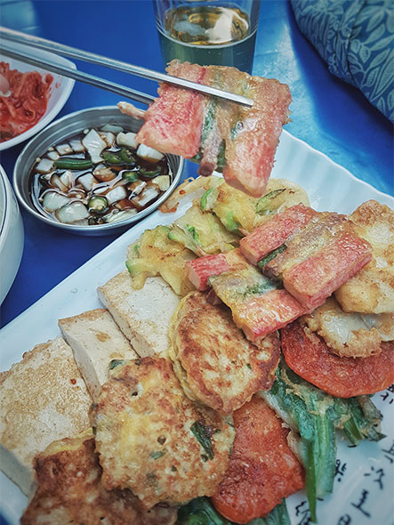 Lo si mangia bevendo una birra come aperitivo, lo si gusta come banchan 반찬 ( i tipici contorni coreani presenti ad ogni pasto) o lo si divora come portata principale. I miei amici coreani mi hanno sempre detto che questo è un piatto che mangiano quando fa brutto tempo, quando il rumore della friggitura va a mischiarsi e a risuonare con il suono della pioggia che cade, come se stessero danzando assieme.