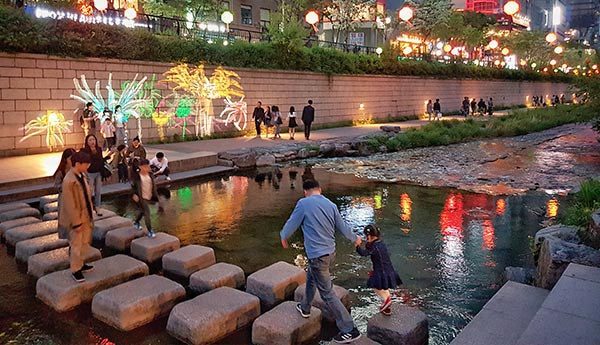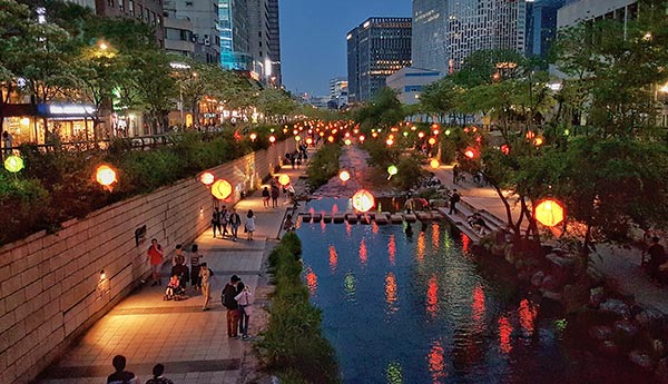 Il corso d’acqua Cheonggyecheon sorge nella piazza Cheonggye, non lontana da alcune delle attrazioni principali di Seoul, dove spesso vengono organizzati eventi, spettacoli e attività culturali. Il ruscello è frequentato da turisti ma soprattutto dalla gente del posto: famiglie, coppiette in cerca di un luogo romantico o impiegati degli uffici circostanti in pausa. L’area presenta alcune piccole cascatelle, qua e là sono state posizionate delle rocce che spuntano dall’acqua e che permettono l’attraversamento dei pedoni da una sponda all’altra, di sera il percorso è piacevolmente illuminato con giochi di luce e proiezioni. Il fiumiciattolo passa sotto 22 ponti prima di gettarsi nelle acque del fiume Hangang. Diversi pesci ed uccelli hanno iniziato ad abitare e popolare lo spazio verde, è stato stimato che il Cheonggyecheon aiuta a diminuire la temperatura di circa 3,5 gradi e il calo delle macchine che entrano in città legato alla rimozione delle strade che passavano qui ha favorito un maggior utilizzo dei mezzi di trasporto pubblico da parte dei cittadini.