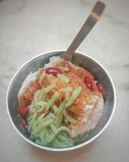 Whenever I happen to be around Malaysia I can’t resist the temptation to taste the excellent and refreshing cendol, a colorful cold dessert with a very sweet taste, made of shaved ice, coconut milk, palm sugar, topped with green jelly noodles made with rice flour and pandan leaf extract and beans.