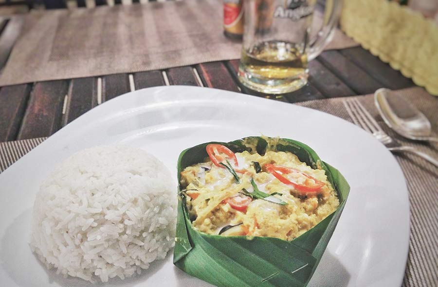 The dish is served in a banana leaf and decorated with some sliced red chili and some thinly sliced kaffir lime leaves, do not forget to accompany the succulent Khmer food with rice!