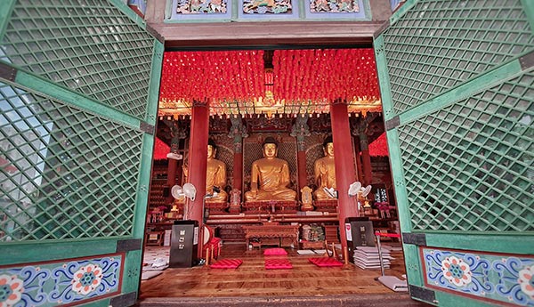 At the center of the building complex is the Daeungjeon : the Buddha Room. It is the main architecture where the daily rituals and songs are held, accessible to all visitors. Built with pine wood, from the high ceiling and the beautiful and colorful external decorations it contains the 3 large golden statues of almost 5m. of height of the buddhas. At the center is Buddha Shakyamuni, founder of Buddhism with Bhaiśajyaguru Buddha to his right, known as the “Buddha of medicine” and to the left the Buddha Amitabha, the “Buddha of light and immeasurable life”. The statues were carved with hands and fingers positioned to form particular gestures, called mudras, which have different symbolic values in the Asian tradition.