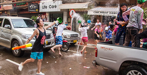 Questo è forse il miglior momento per visitare il Laos, ricordatevi che non potrete non essere inseguiti da qualcuno che vorrà cordialmente inzupparvi di acqua fino alle mutande, quindi massima precauzione! Non portate in giro macchine fotografiche costose (o almeno proteggetele), computer o altro materiale elettronico in zaini non impermeabili, di solito vendono custodie per i cellulari che dovrebbero impedire all’acqua di penetrare…se vi fidate!