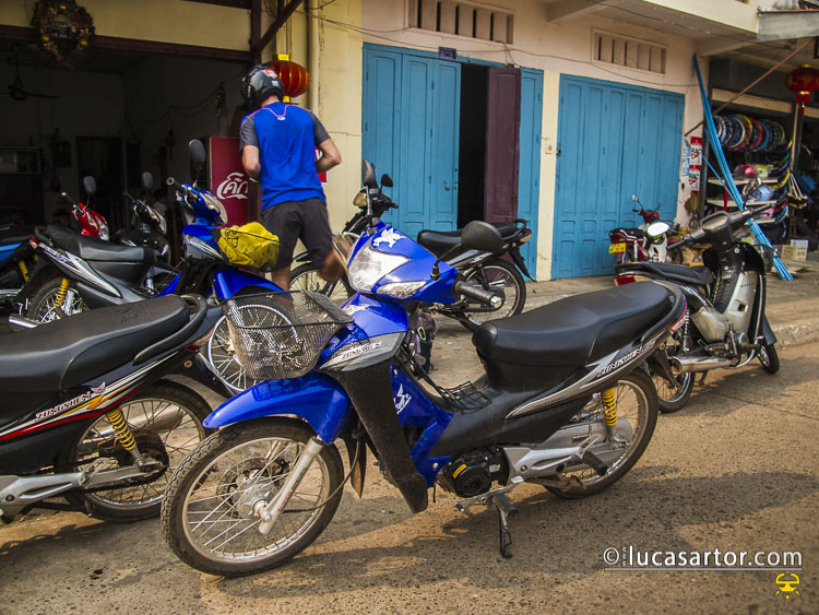 Arrivo di sera e ho la piacevole sorpresa di ricevere un messaggio da un amico francese che mi sta raggiungendo da Bangkok per unirsi all’avventura. Nell’attesa inizio a guardare i prezzi del noleggio degli scooter, piuttosto cari rispetto alla media del paese. Parlando un po’ qua e là con altri viaggiatori scopro un posto con delle buone moto ad un costo decente, che contrattando un po’ diventa accettabile: 70000 kip al giorno (circa 6€) per uno scooter cinese semiautomatico.