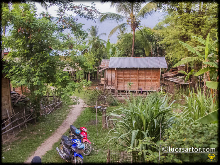 Di notte non riusciamo a dormire in quanto la stanza adibita a nostra temporanea camera da letto è a 10 metri dalle casse dell’impianto dal quale sparano a tutto volume musica laotiana e thai tutta la notte. Finiscono i divertimenti verso le 5 di mattina, poco prima che il gallo inzi a cantare. Immaginavo la vita del villaggio molto meno movimentata, ma nonostante il non aver dormito la permanenza è stata eccezionale!