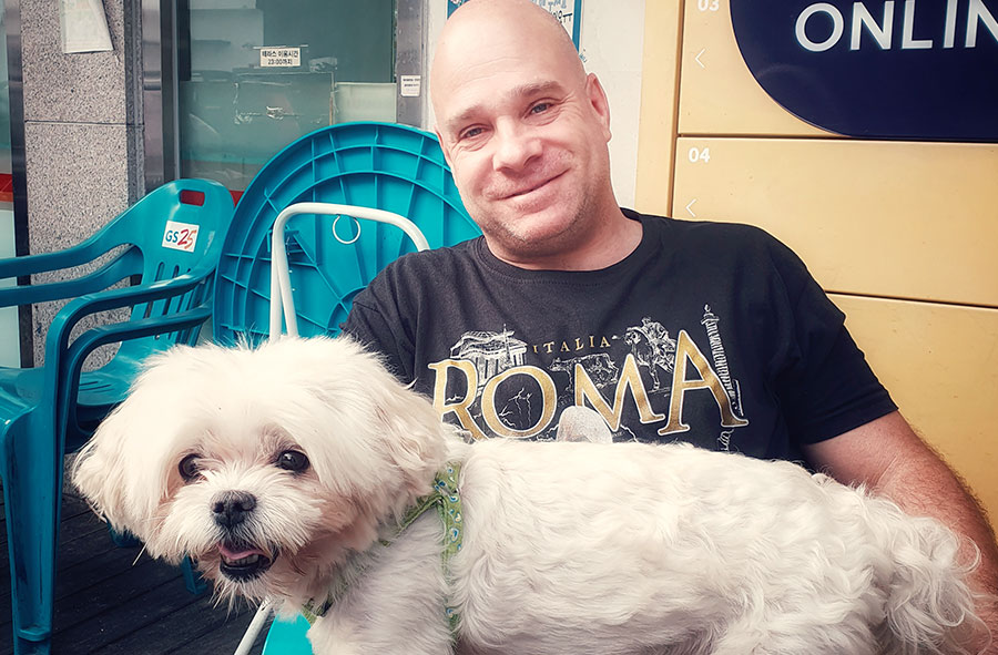 Incontro Pettersson e il suo inseparabile amico a quattro zampe in un parco di Seoul. Oggigiorno non è facile trovare un posto per sedersi all’aperto in quanto il distanziamento (anti)sociale ha bloccato orrendamente diverse aree urbane imbrattate con nastri bianchi e rossi che paiono un enorme insulto alla vita e alla normalità. Una panchina fortunatamente è libera.